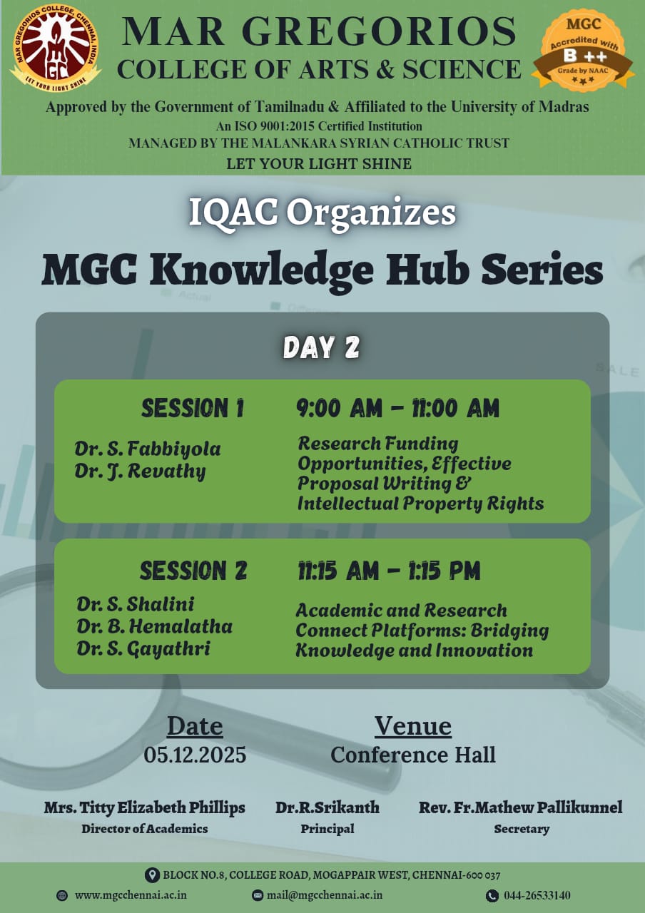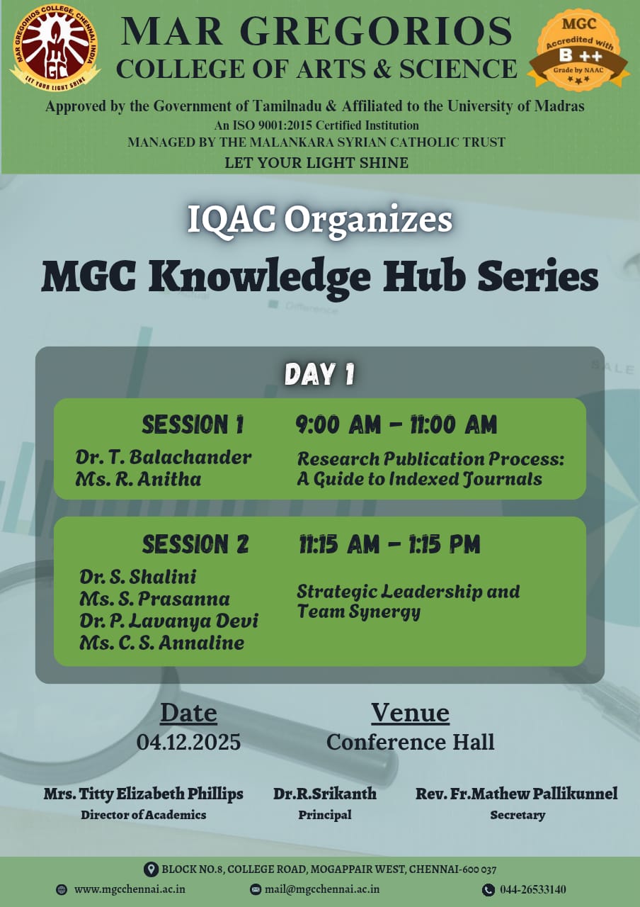 MGC Career Guidance Cell in association with IQAC organised a Seminar on the topic "PLAN YOUR HIGHER EDUCATION IN ABROAD " on 26th Feburary 2024 in Mar Ivanious Hall for the final year students. Mr. M.Hari, CEO, Mr.Cecil Rogers , Regional Manager and Mrs.Bharathi , Branch Manager, Intelligent Overseas Education were the resource persons. They narrated the importance of abroad studies and guided the way to go abroad like eligibility criteria, approaching scholarship and way to balance their economical situations etc. Sr. Celin Maria started the session with her blessings. Let us congratulate the Convenor , Ms. S. Arockiya Princey, and the Co-Convenor Dr. P. Sivasankari for organizing the program successfully.