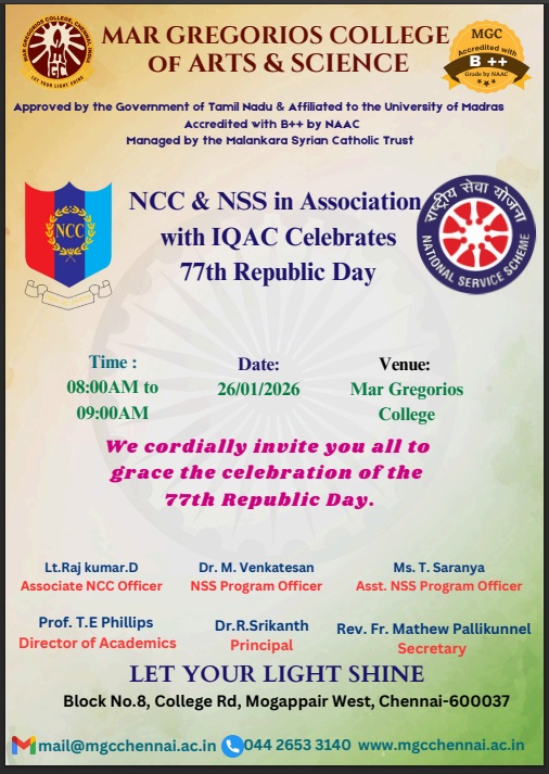 Mar Gregorios College celebrated the 70th Republic Day with pomp and gaiety. Patriotic fervour was brimming in the campus of M.G.C. Rev.Dr.Thomas Mar Anthonios, Bishop, St. Ephrem Exarchate, Pune, Rev.Fr.Philip Pulipra, Secretary and Dr.K.Mohandoss, the Principal graced the occasion.