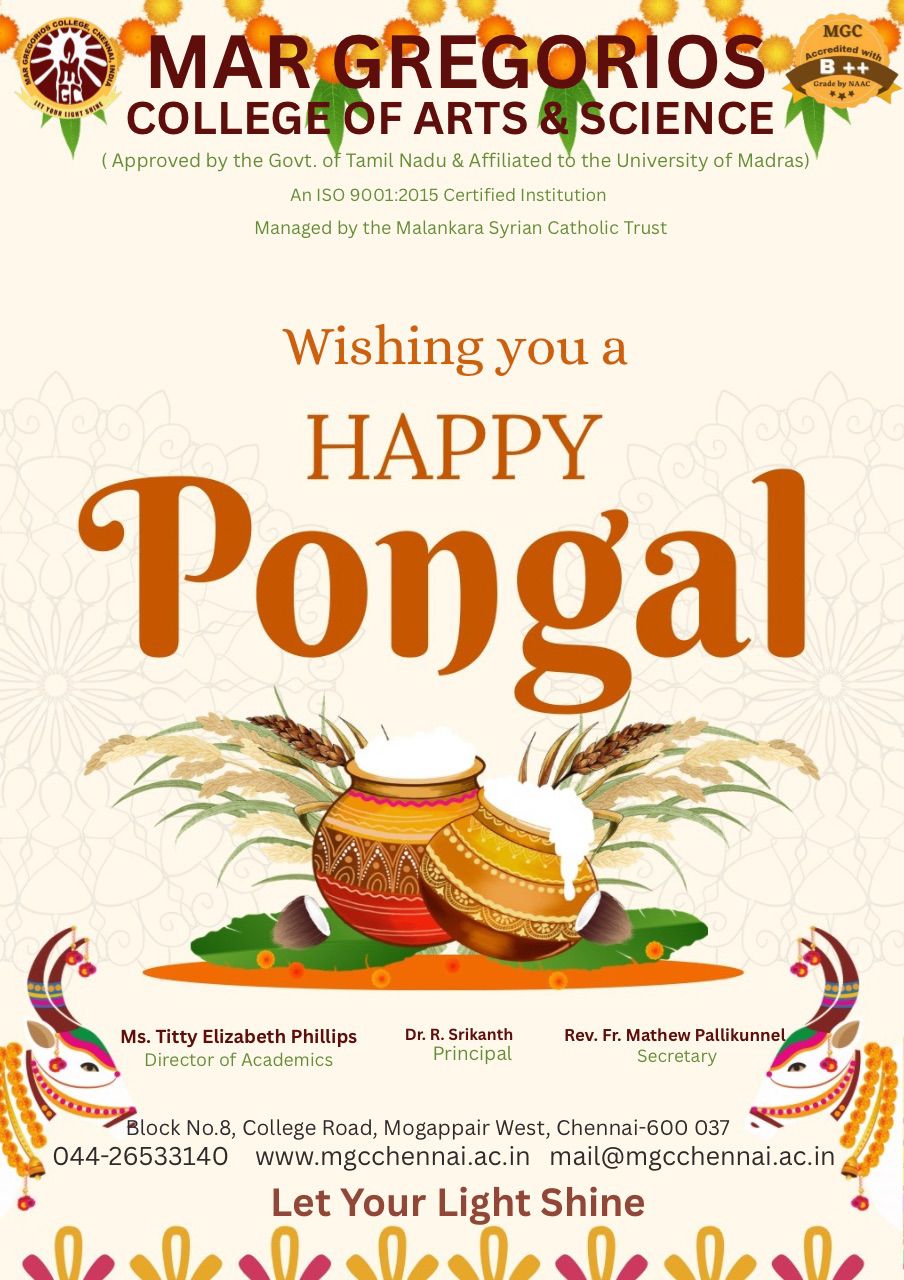 Mar Gregorios College celebrated Pongal festival on 12 January 2019. The NSS Volunteers gave a spectacular performance through the traditional folk dance, Karagam, Kambattam, Villupattu etc with folk music.
