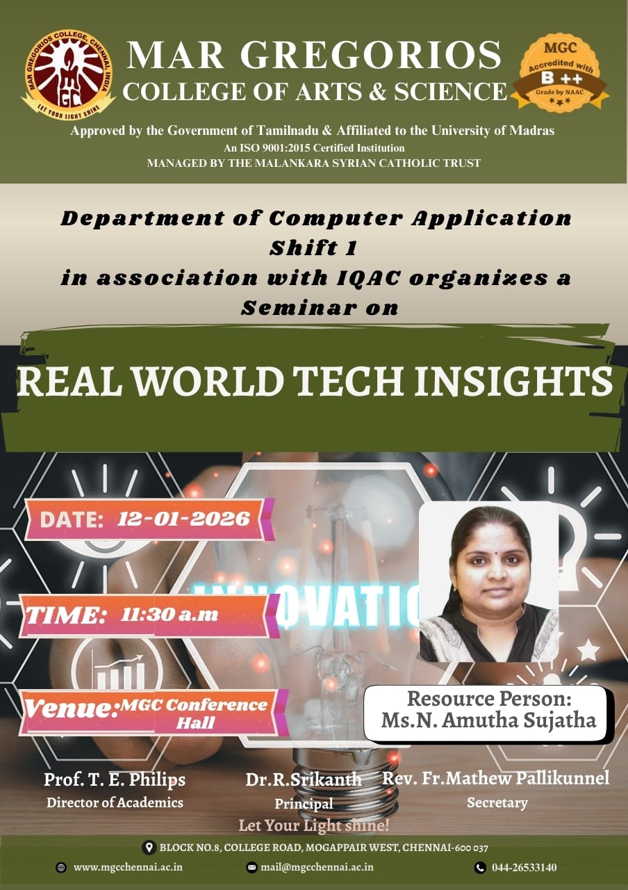 MGC Department of computer Application shift-I organized International Conference on “Recent Trends in Information Technology” on 11th&12th Nov 2021 at 09.30am to 4.00pm. Resource Person Prof Dr Houssain Kettani , University of South Callfornia,Texea,USA.,Prof Dr T.Velmurugan D.G.Vaishnav college,chennai,Mrs Jayanthi Ganesan Senior Software Engineer,Dallas, Texea,USA. |