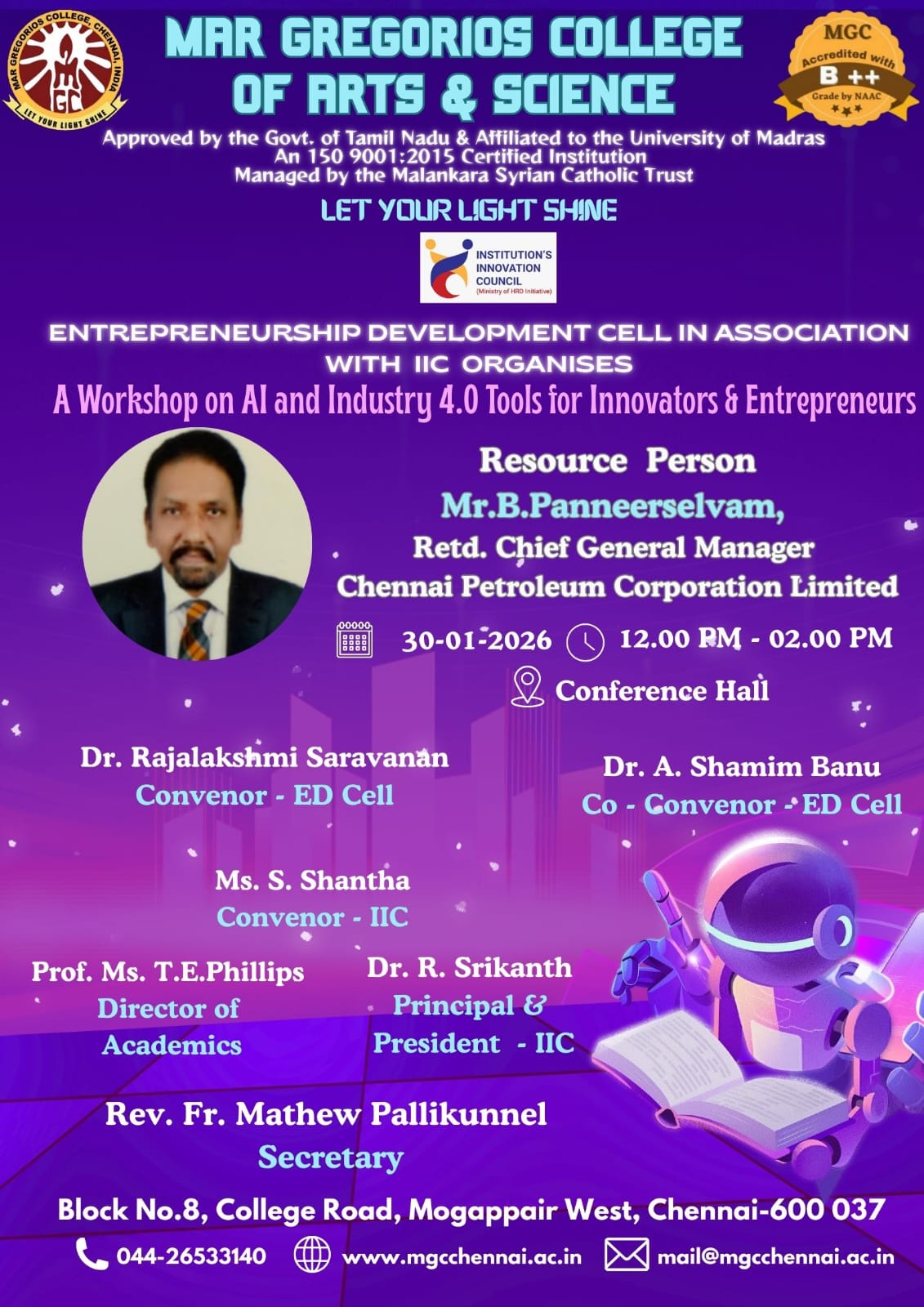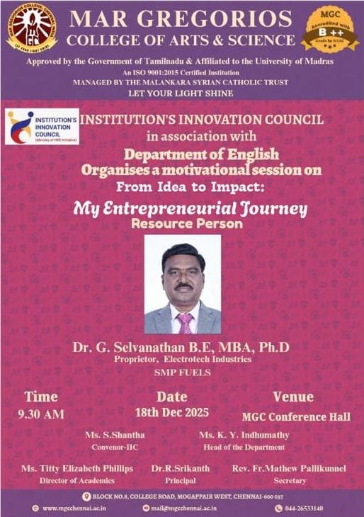 MGC Department of Business Administration shift-II in association with IQAC organized Guest Lecture Programme on “The Impact of Product Planning and Control on operactionl Cost of Manufacturing Industries" on 13-12-2021 at 6.30pm. Resource Person Prof Dr A.Elaiyaraja,St.Thomas College,Chennai.