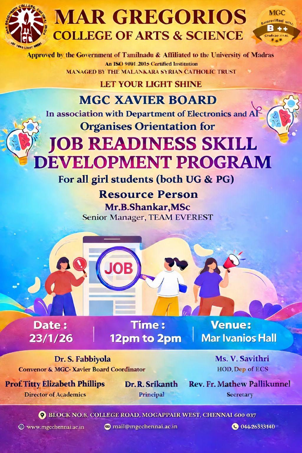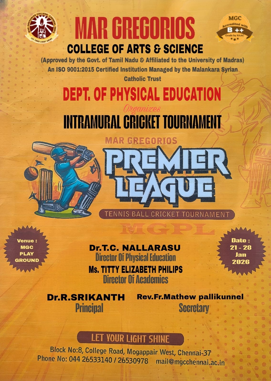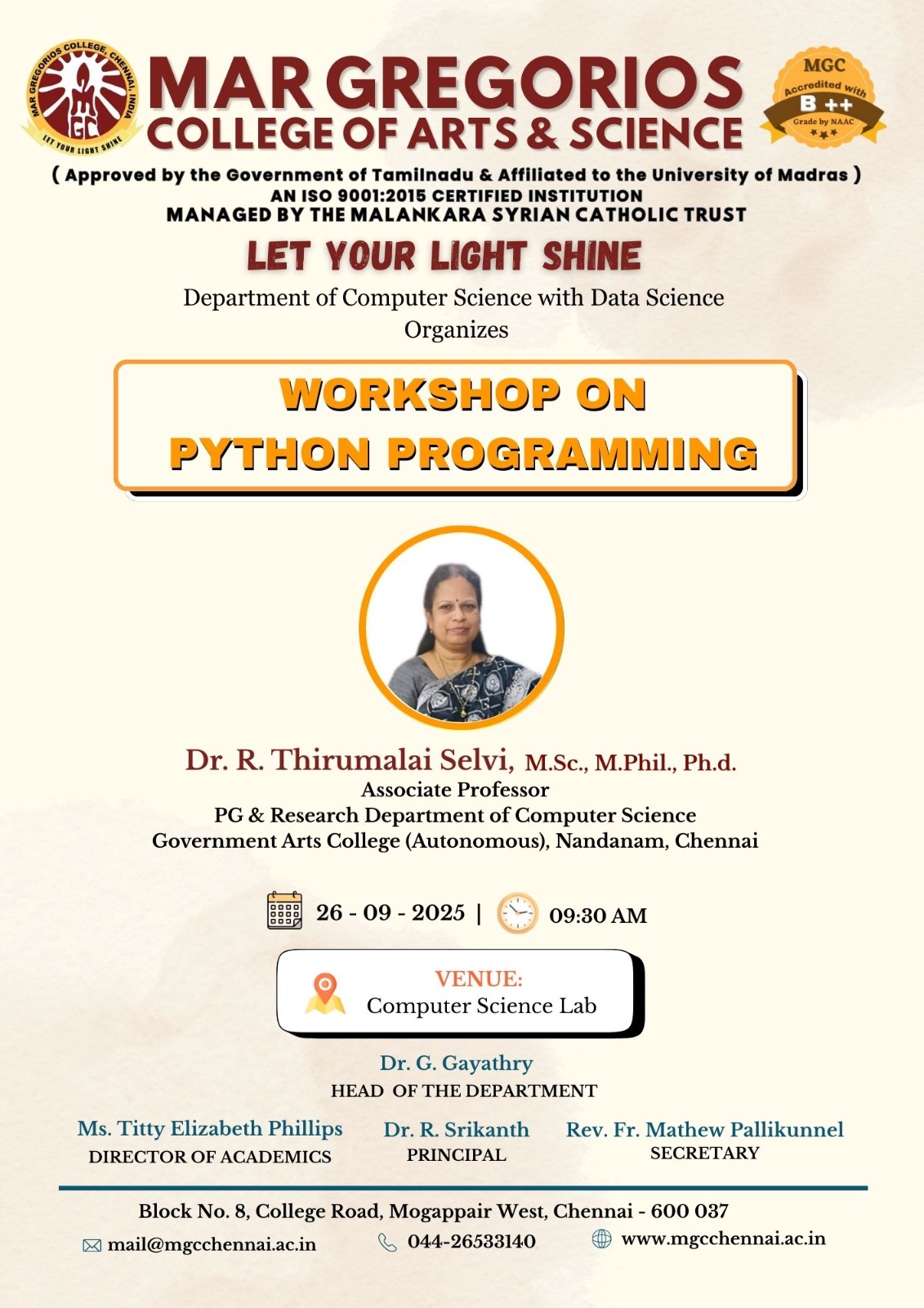MGC family cordially invites the Parents & Students for the virtual "Orientation Program" on 15th Sept 2021 at 9.30am.Inaugural Address:- Dr.M.Sivarajan Principal,Blessings Rev.Fr.Philip Pulipra Secretary.