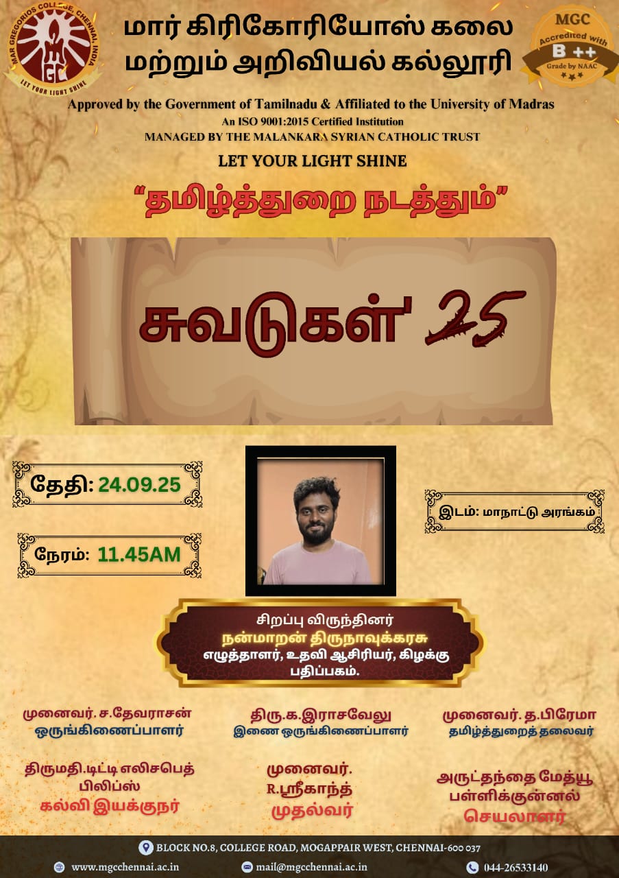 MGC Department of Tamil shift-I in association with IQAC organized Guest Lecture Programme on “Purapporul Venbamalai Oru Parvi " on 09-12-2021 at 4.30pm. Resource Person Prof Dr S.Amalraj ,Loyola College,Chennai.